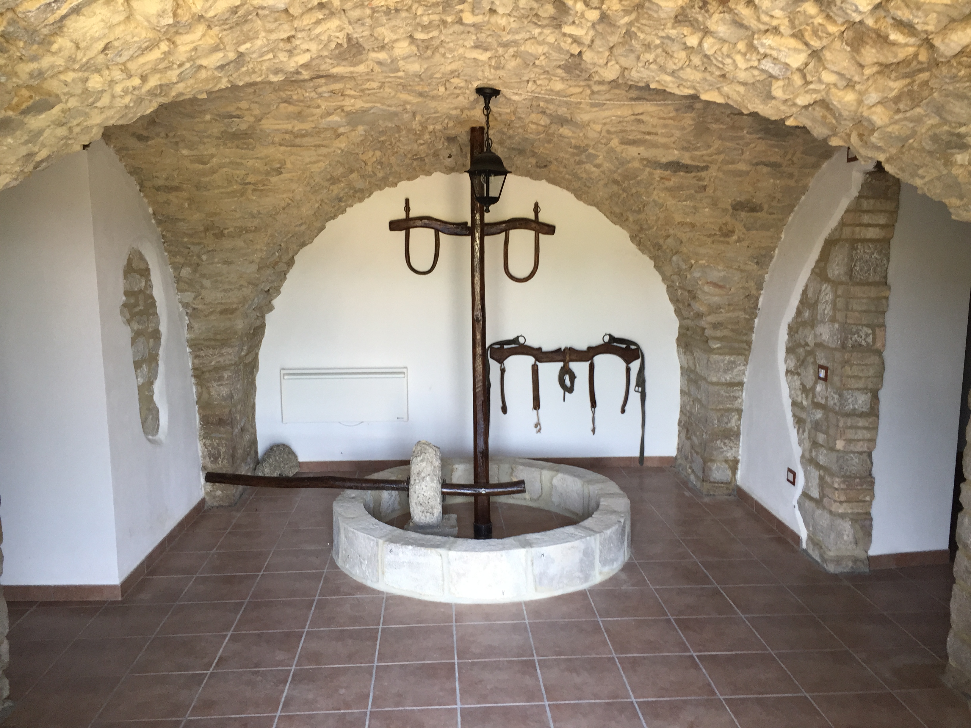 Nel punto focale del seminterrato è ubicato un antico “TRAPPETO” FRANTOIO usato per la trasformazione delle olive. Costituito da un mortaio circolare in pietra con al centro la macina, una ruota di pietra forata trainata da un MULO/ASINO per macinare le olive.